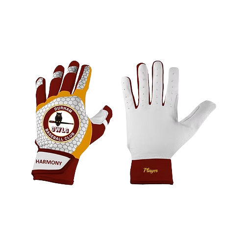 * Harmony custom sublimated batting gloves with player name finishes.